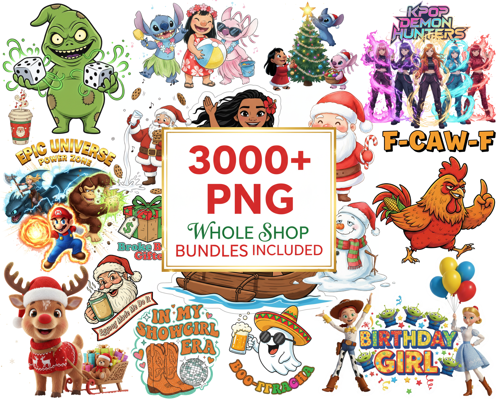 Bring your designs to life with 3000+ high-quality PNGs featuring your favorite characters, themes, and styles — from Disney vibes to K-pop energy, cartoon classics to festive fun.